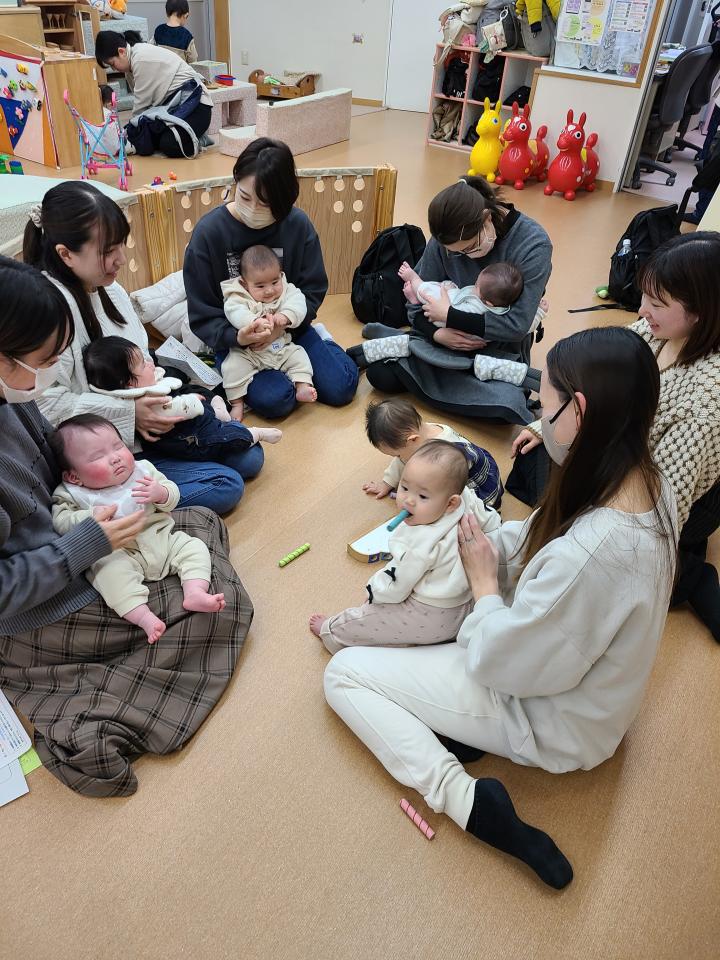 ひだまりを初めて利用する親子向けに「はじめましての日」を設けています。手遊びをしたり、お母さん同士で話したり、絵本を読んだりしています。