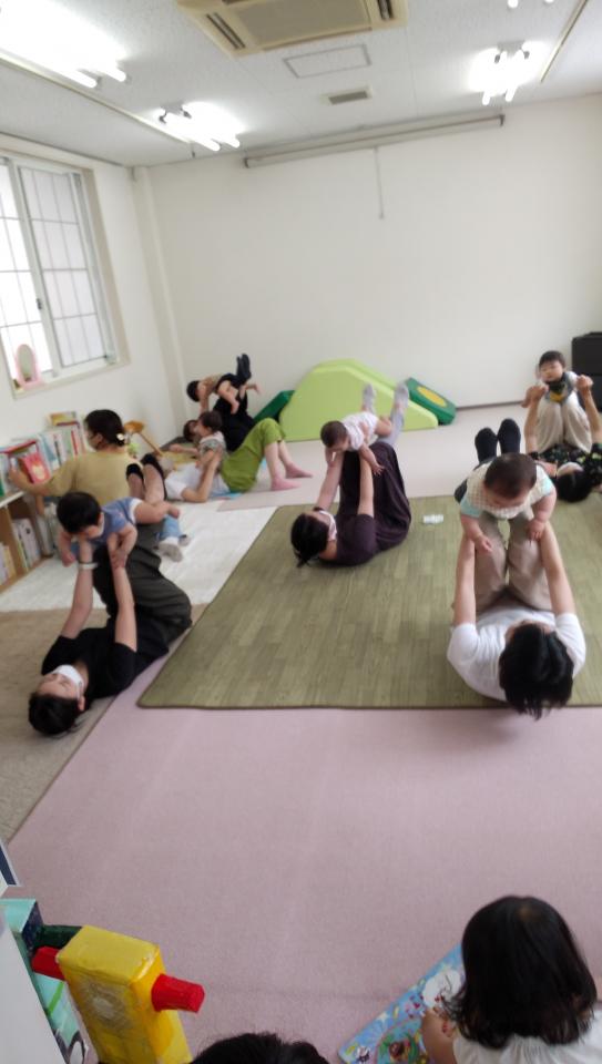 親子で、年齢(月齢)に合わせた運動遊びをしています。布や手づくりマットを使ったり、音楽に合わせて踊ったりしています。