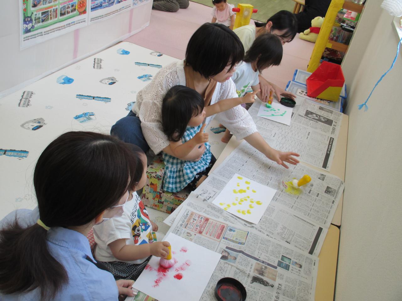 毎月1回、スタンプあそびや季節の制作、赤ちゃんのおもちゃ作りなどをしています。